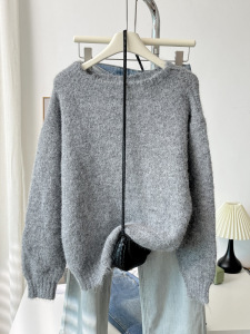 圆领一字肩套头软糯羊驼长毛毛衣女秋冬慵懒风宽松露肩针织衫上衣