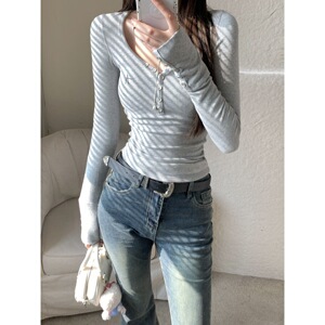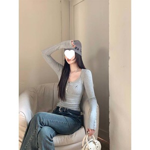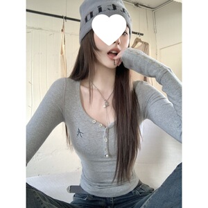 美拉德咖色针织打底衫女秋冬v领纽扣美式辣妹修身显瘦短款t恤上衣