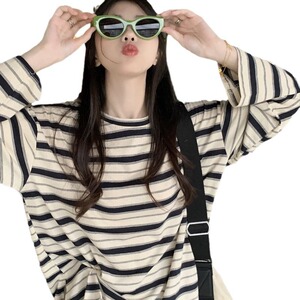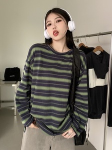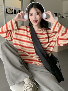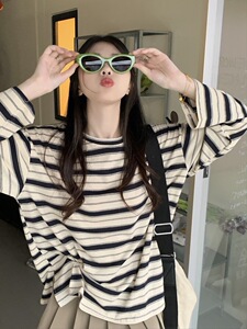 设计感小众开叉条纹打底衫女内搭春秋宽松卫衣大码长袖T恤女上衣