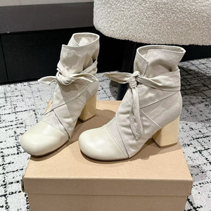 高端品质25秋冬圆头蝴蝶结绑带时装短靴粗跟及踝裸靴高跟马丁