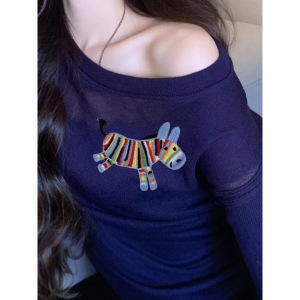 斜肩露肩彩虹小马藏青色针织衫女秋装2025年新款秋冬韩系穿搭上衣
