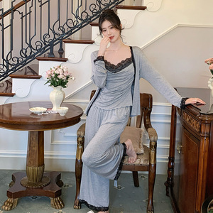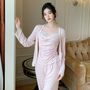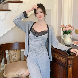 法式睡衣女胸垫吊带套装秋季三件套长袖长裤套装可外穿家居服