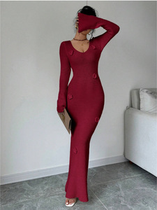 新款立体V领收腰针织连衣裙女春秋季设计感显瘦包臀鱼尾裙子