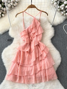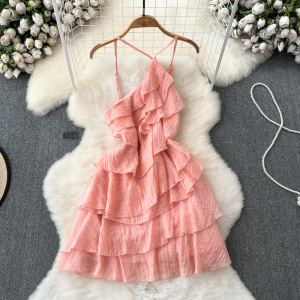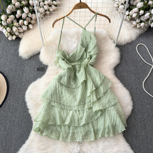 2025夏季法式温柔风甜美挂脖露背收腰显瘦无袖a字蛋糕雪纺连衣裙