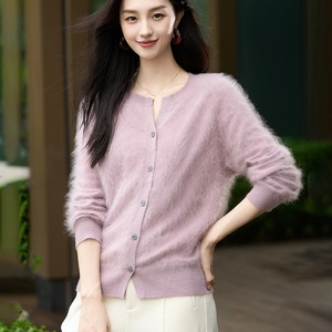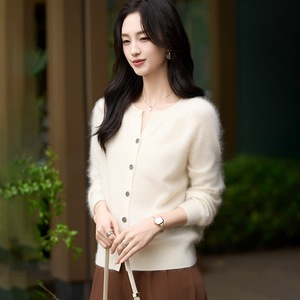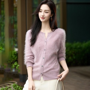 100纯羊毛拉绒工艺针织开衫女式V字领加厚短款外套时髦洋气风毛衣