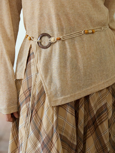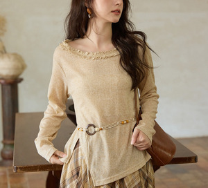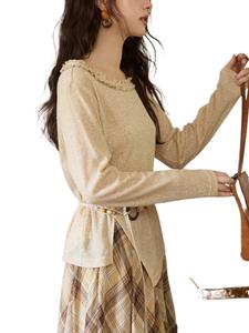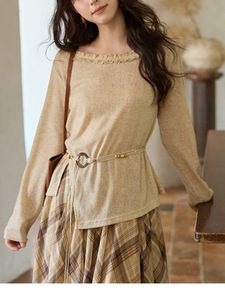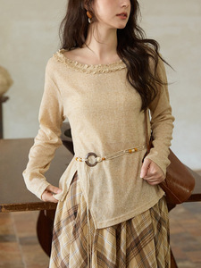 杏色苎麻轻薄针织衫+波西米亚腰带2025早秋木耳边领侧开叉薄上衣