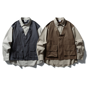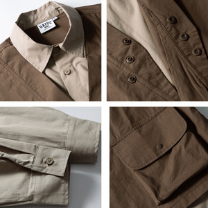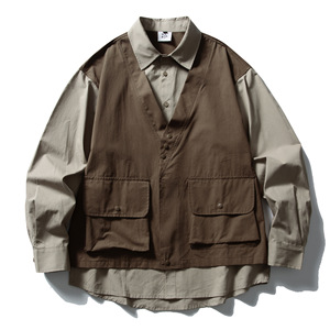 日系复古阿美咔叽假两件拼接多口袋工装衬衫男女宽松纯棉长袖衬衣