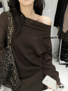 THE LIMON柠檬绿茶秋季女韩系设计感条纹百搭显瘦斜肩长袖针织衫