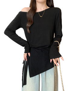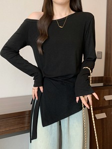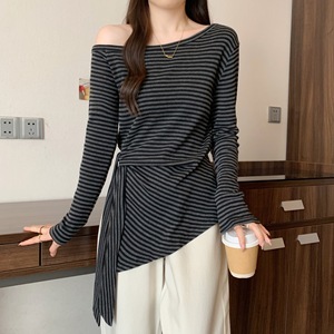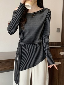 早秋2025新款露肩条纹长袖T恤大码女装不规则收腰绑带打底衫上衣