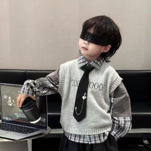 儿童套装洋气2025新款韩版男童学院拼接衬衫针织马甲裤子潮三件套