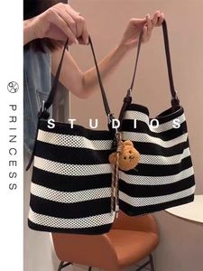 包包女式2025新款超火黑白条纹编织水桶包大容量度假休闲斜挎大包
