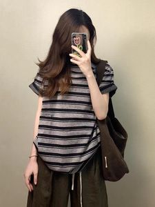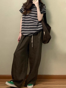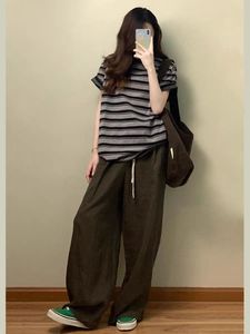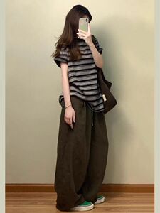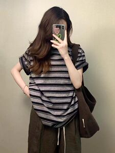 美式复古运动套装女夏季宽松时尚慵懒风条纹短袖阔腿裤休闲两件套