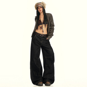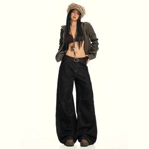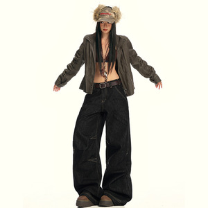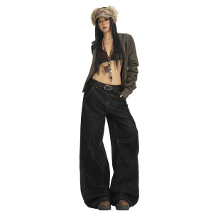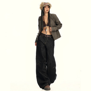 【今茵】美式复古水洗压褶设计感痞帅高街宽松阔腿牛仔裤子男女潮