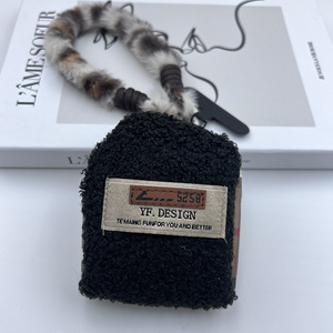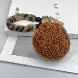 秋冬毛绒手机挂绳豹纹圆形手提包包挂件腕带耳机钥匙零钱迷你包包