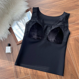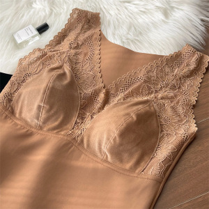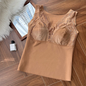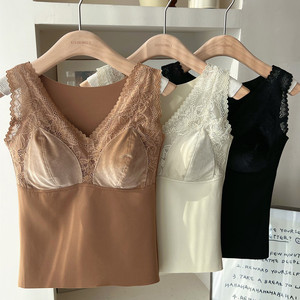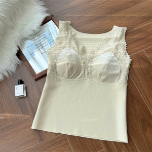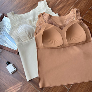 高级感缎面蕾丝背心打底带胸垫一体固定杯修身磨毛绒保暖内衣美背