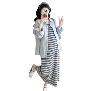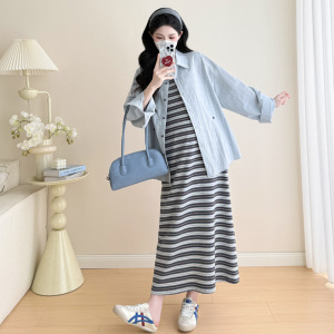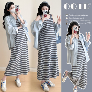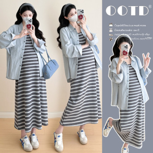 孕妇装2025秋季新款休闲外出针织条纹背心裙+可调节衬衫两件套装