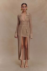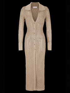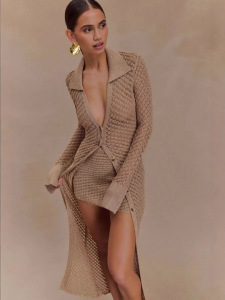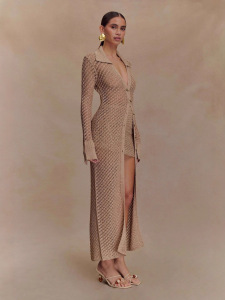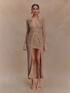 跨境欧美镂空金属感长款长袖翻领针织沙滩开衫时尚纯色连衣裙