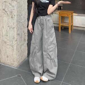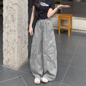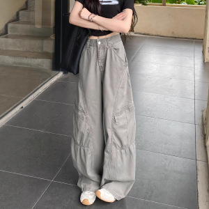 小个子美式复古灰色工装阔腿牛仔裤女高腰宽松显瘦直筒拖地长裤潮
