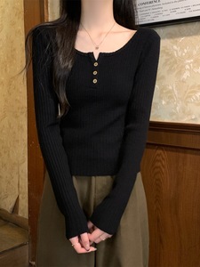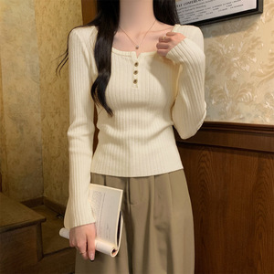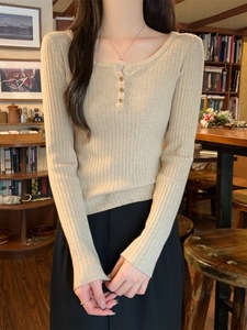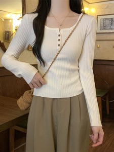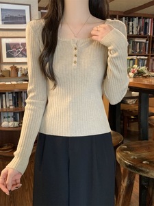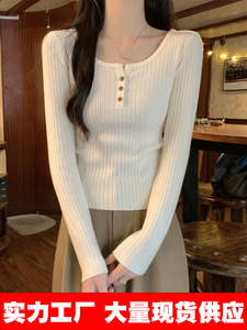 包芯纱面料 法式方领针织毛衣打底衫2025肌理感修身纽扣长袖上衣