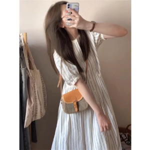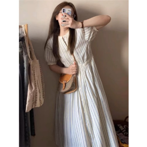 茶歇法式甜美初恋桔梗复古多巴胺温柔风白色条纹泡泡袖衬衫连衣裙
