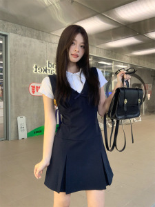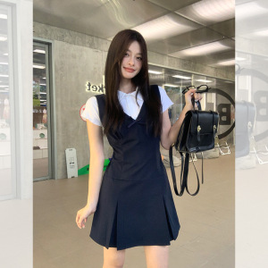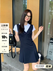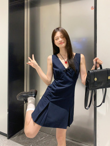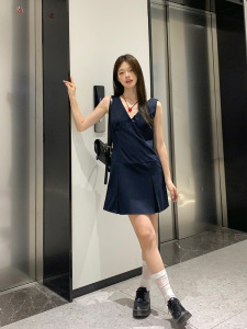 宋正恩藏蓝V领学院风吊带连衣裙女夏季背心裙韩系收腰无袖短裙子