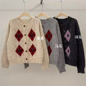 韩系复古菱格绣花圆领针织开衫女秋冬新款时尚洋气毛衣女外套上衣