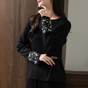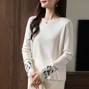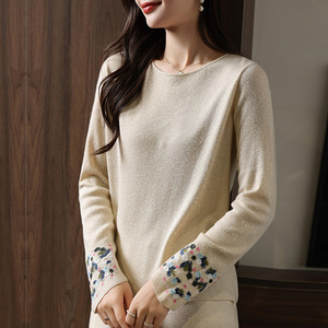 新款精纺30%羊毛衫针织上衣女圆领亮丝毛衣刺绣新中式打底衫
