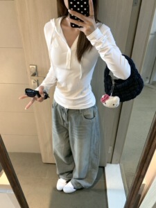 美式辣妹半开V领纽扣连帽长袖t恤女夏季白色修身短款亨利领上衣新