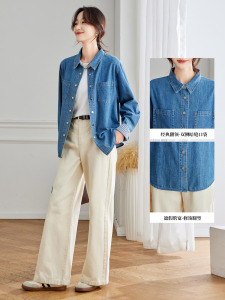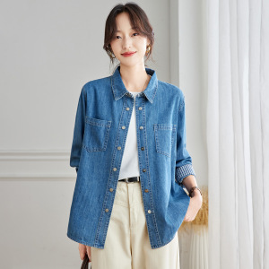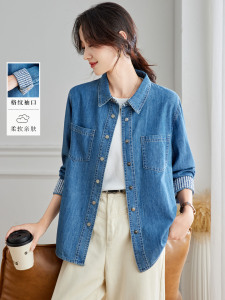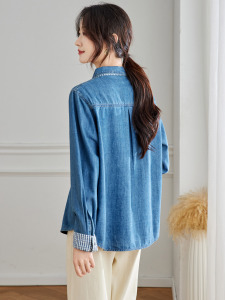 棉茧 袖口拼格子牛仔衬衫女装秋季新款通勤百搭衬衣韩系叠穿外套