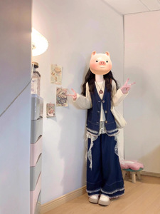 大码女装秋季新款微胖mm显瘦遮肚马甲背心阔腿裤时尚牛仔三件套女