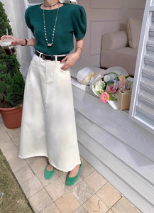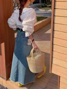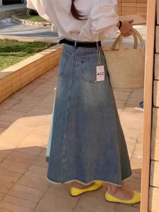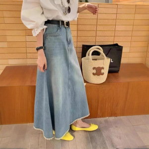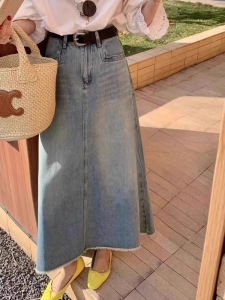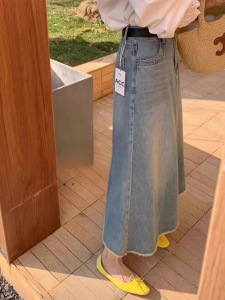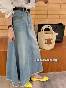 复古毛边牛仔半身裙女夏季薄款梨形身材大码胖mm中长款A字鱼尾裙