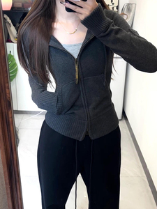 慵懒风感显瘦灰色毛衣外套女秋冬季2025新款外穿连帽针织开衫