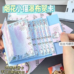 店铺热卖【2套材料包+送双面胶】瀑布贺卡自制贺卡【烟花小猫】生日祝福/节日送礼