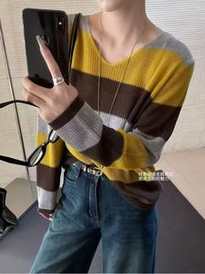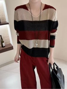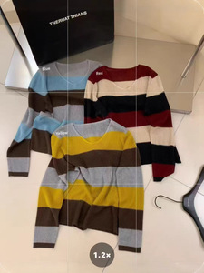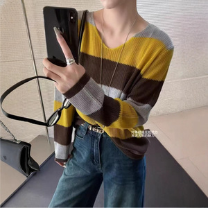 秋季新款濮院羊毛衫v领拼色条纹长袖高品质上衣镂空韩版毛衣女装