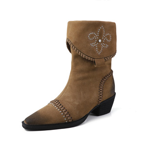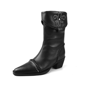 废土风~新款重工铆钉长靴女方头V口套筒不过膝骑士靴方跟加绒女靴