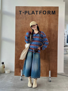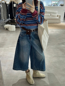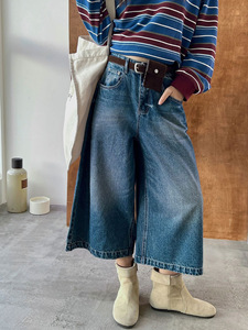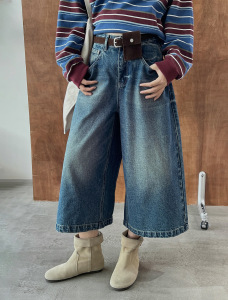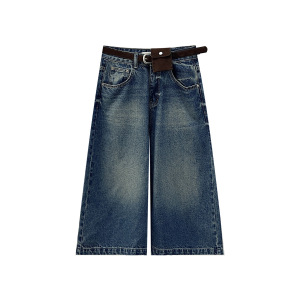 [简裁]T-PLATFORM广州十三行 早秋复古做旧折痕牛仔七分裤93080