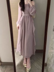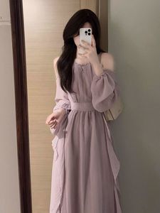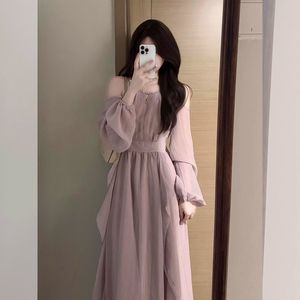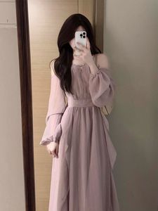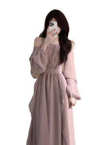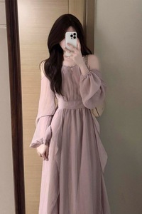 法式温柔风小个子紫色荷叶边露肩泡泡袖收腰连衣裙女秋季新款
