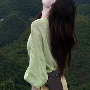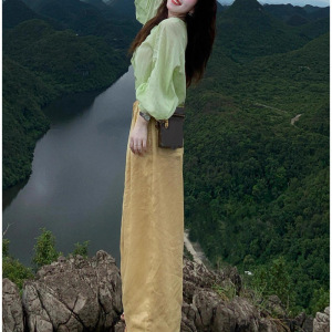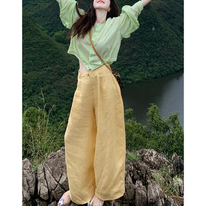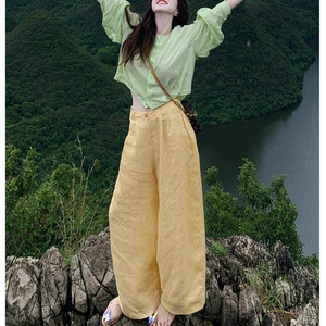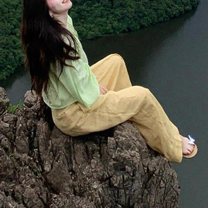 早秋多巴胺穿搭小个子韩系慵懒松弛感绿色上衣黄色亚麻阔腿裤套装