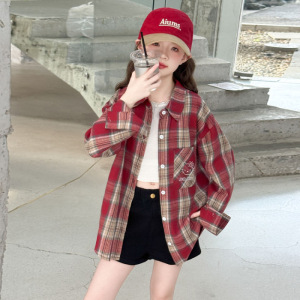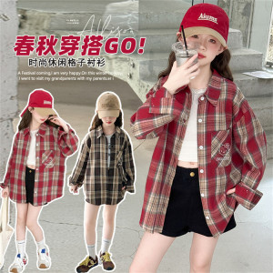 女童早秋格子衬衫外套中大童宽松拼色百搭春秋新款中长款长袖夹克