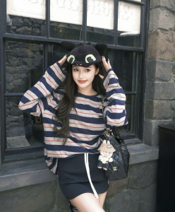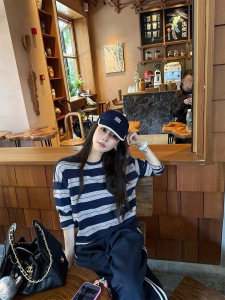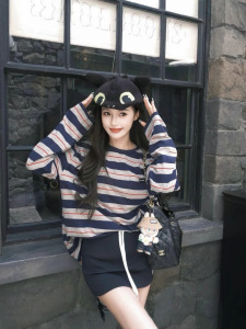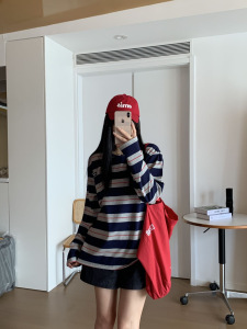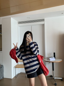 25东大门早秋新款慵懒风复古宽条纹上衣时尚韩版宽松长袖T恤女款