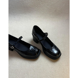 羊皮版~法式复古一字扣粗跟玛丽珍小皮鞋女通勤百搭黑色单鞋