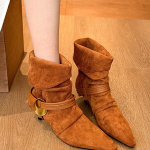 羊皮版~法式美拉德复古枫叶棕金属扣尖头细跟中筒靴女显瘦堆堆靴