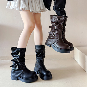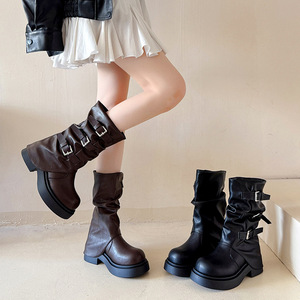 腿精担当!增高6cm皮带扣方圆头褶皱中高筒骑士靴2025新复古百搭
