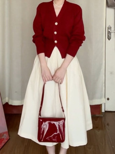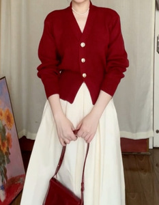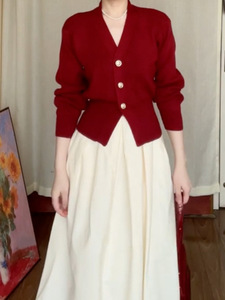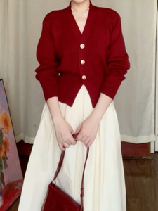 法式复古红色V领针织开衫女2025秋季穿搭短款收腰慵懒风外套上衣
