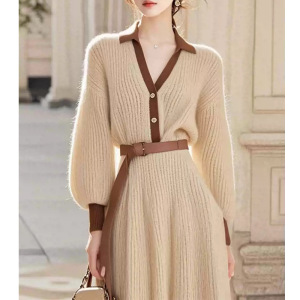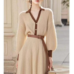 超好看小香风卡其色针织连衣裙子2025秋冬轻熟风高端精致收腰长裙