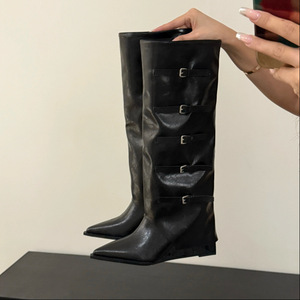 羊皮版~黑色不过膝长靴女皮带扣坡跟裤管靴复古气质高筒骑士靴