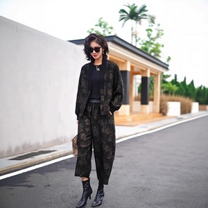 秋原创大码文艺复古国风优雅气质新中式夹克外套宽松阔腿裤两件套