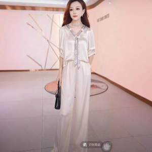 时尚珠光缎气质套装阔腿裤2025洋气秋季新款时尚上衣两件套