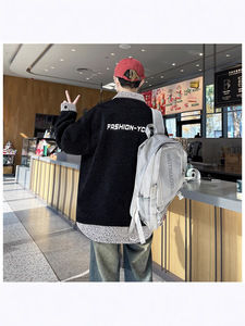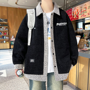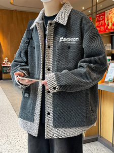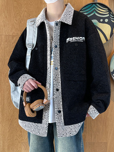 春秋季拼接翻领小香风针织外套男潮流宽松大码帅气休闲青少年夹克