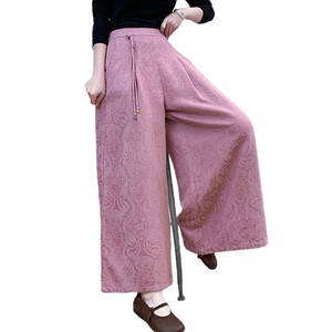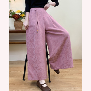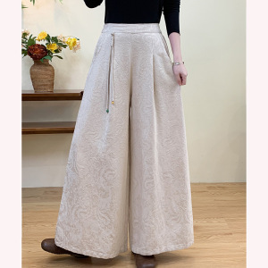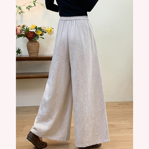 2025秋季新款松紧腰大码显瘦直筒裤纯色民族风棉麻提花吊坠阔腿裤